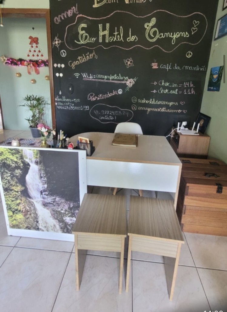 ECOHOSTEL CANIÔNS –Possue 01 Suite com banheiro (duas pessoas) 01 Quarto de casal (2 pessoas), 01 Quarto com duas camas de casal (04 pessoas) , 01 Quarto com 2 beliches (quatro pessoas), 01 Quarto 03 beliches (06 pessoas). Possui banheiro social, banheiro na rua , cozinha compartilhada, área de churrasqueira, espaço para fogueira, redário e quiosque- FORNECE ROUPA DE CAMAS /NÃO FORNECE TOALHAS (INCLUSO 01 PERNOITE COM CAFÉ DA MANHÃ )
