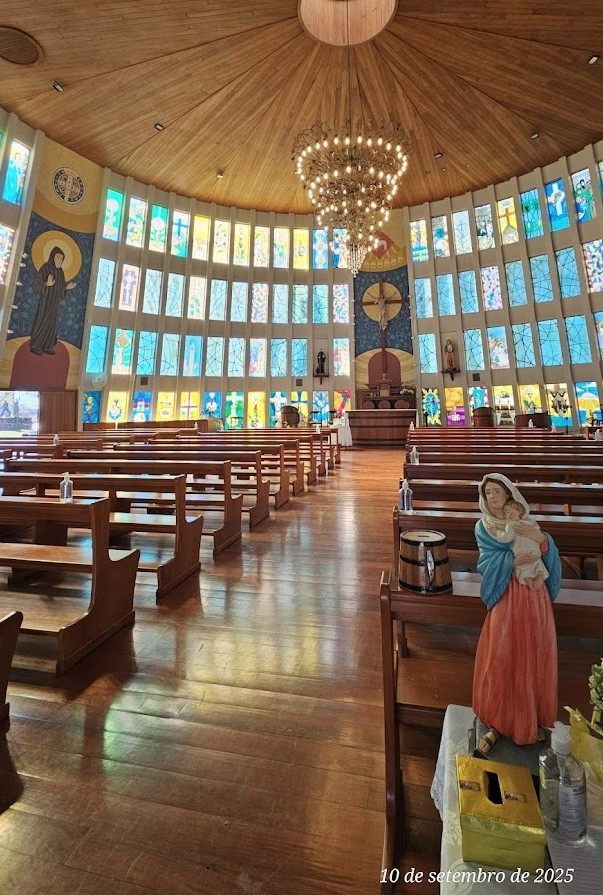 VISITA A IGREJA EM FORMATO DE PIPA-Homenagem ao Imigrantes a Igreja tem o formato de Pipa. Os bancos possuem gravações com simbologia da uva além de belos  vitrais Coloridos. Abriga até 1000 pessoas