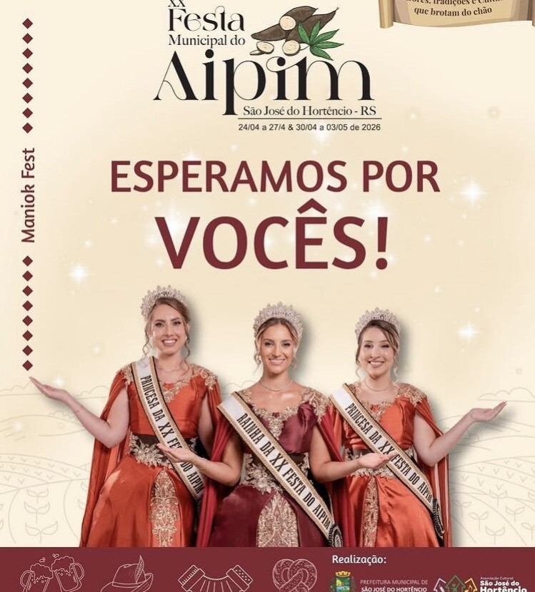 A XX FESTA DO AIPIM DE SÃO JOSÉ DO HORTÊNCIO É UMA CELEBRAÇÃO CULTURAL E COMUNITÁRIA QUE INTEGRA O CALENDÁRIO OFICIAL DE EVENTOS DO MUNICÍPIO. Realizada desde sua primeira edição com o propósito de valorizar os produtos agrícolas locais, especialmente o AIPIM (MANDIOCA), a festa consolidou-se como um marco na VALORIZAÇÃO DA IDENTIDADE HORTENCIENSE E NO FORTALECIMENTO DAS TRADIÇÕES DO INTERIOR GAÚCHO.